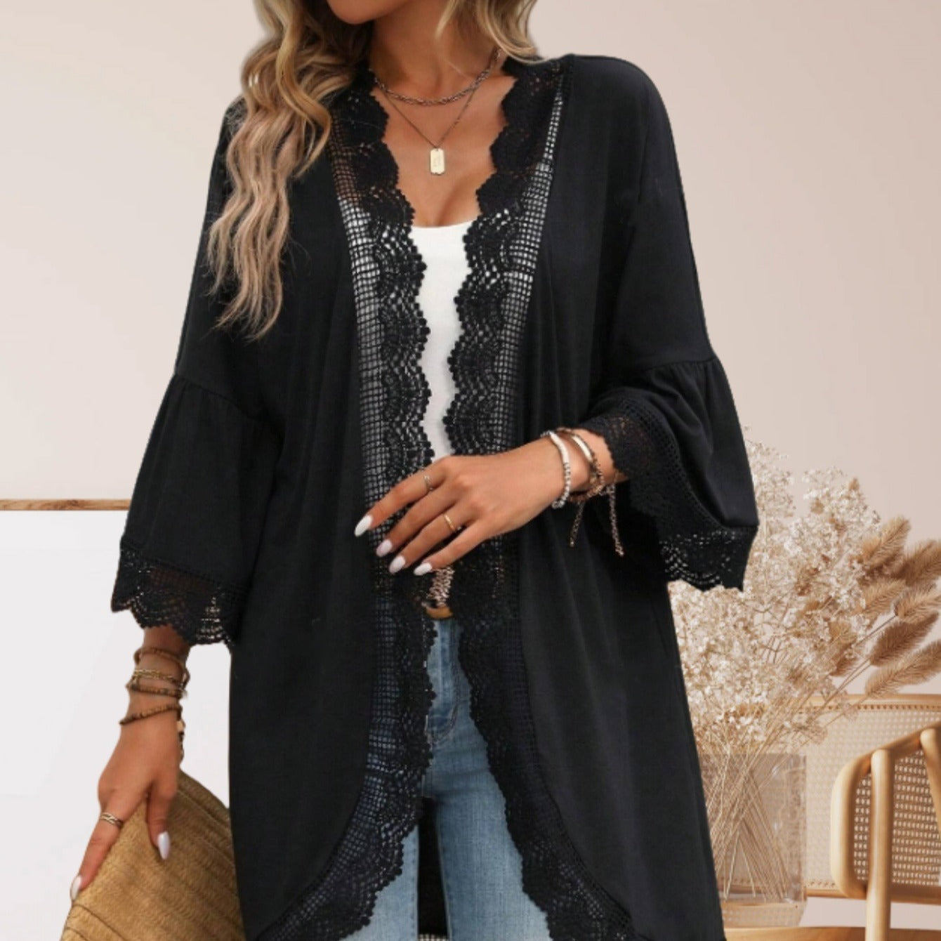 - Detaljer: Åben front og vidt udskårne ærmer for et luftigt look.