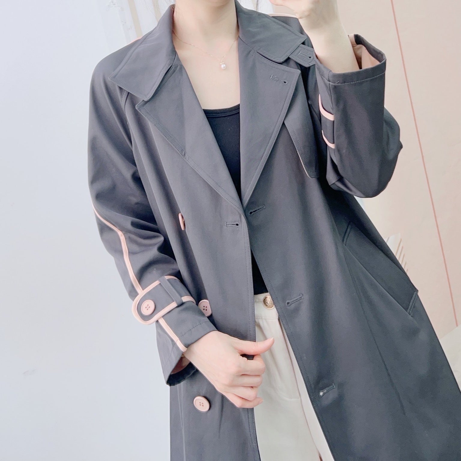 - Modige detaljer: Elegante knapdetaljer og farvede accenter på ærmerne giver trenchcoaten et stilfuldt præg.