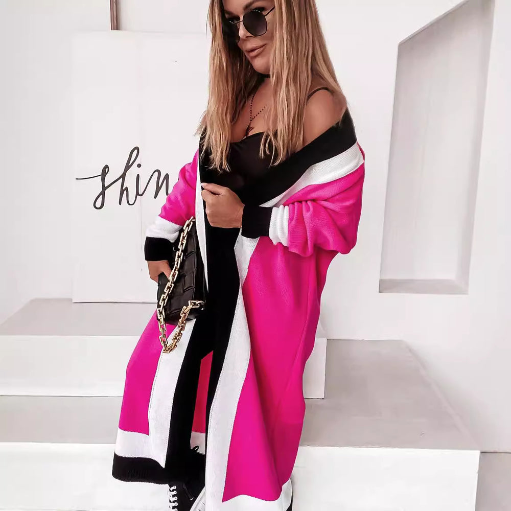 Dame moderigtig lang strikfrakke med usædvanligt farveblokkedesign og bred krave Stilla