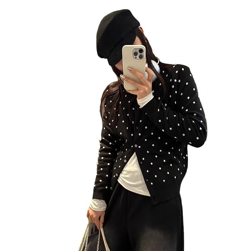 Kvinders cardigan med moderne prikker og fin knaplukning